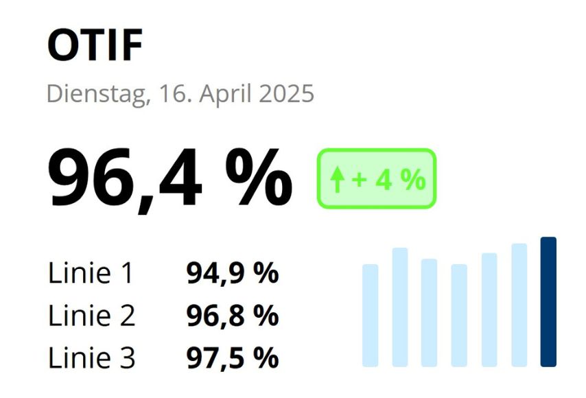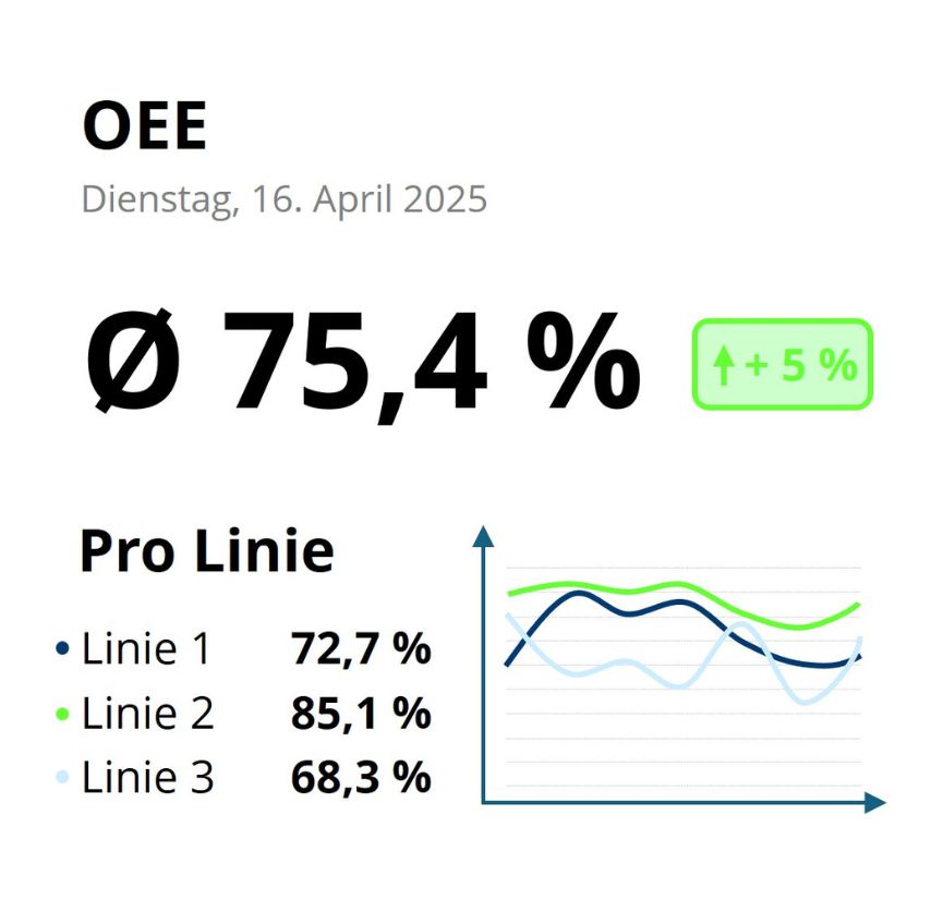 Ergebnis: OEE +5,5 Prozentpunkte, Mikrostops –25 %, Rüstzeiten –11 %.