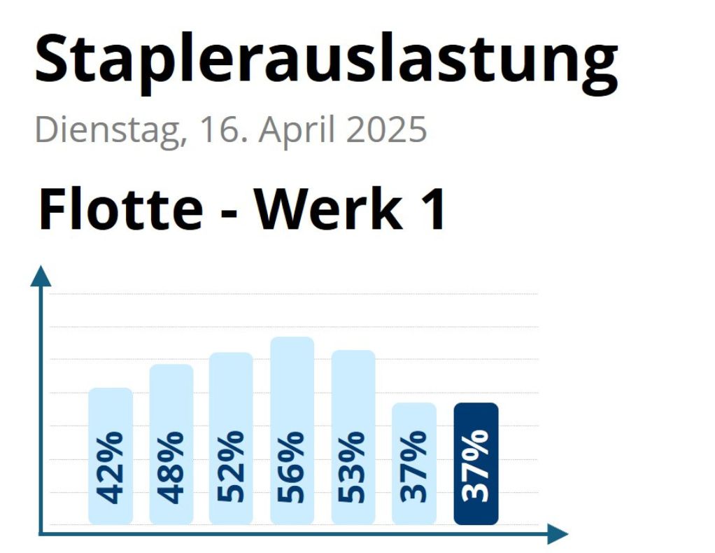 Vorgehen: IoT-Devices an die FFZ → Flottenanalyse: Produktivität (beladen/unbeladen), Auslastung in %, Shocks, Fahrdistanzen → Abgleich mit Transaktionen/Picks → Ableitung: Sensitivitätsanalyse & Empfehlung der optimalen Flottengröße, Optimierung der Picklisten, Doppelspiel-Potenzial → Erstellung eines kennzahlenbasierten Flotten-Dashboards.