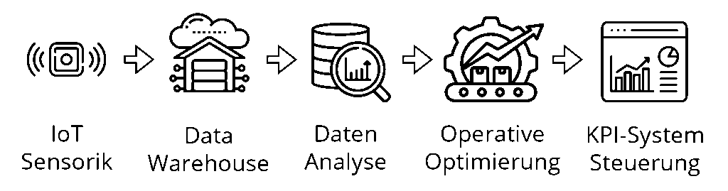 Vorgehen: IoT-Device an der Fördertechnik → Ermittlung der Prozesszeiten, Durchlaufzeiten & -Taktung → Analyse & Bewertung der Lagerstrategie (Heatmap) → Analyse & Optimierung der Replenishment-Strategie → Erstellung eines kennzahlenbasierten Materialfluss-Dashboards.